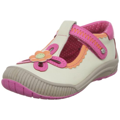 ? She'll look pretty dressed up or down in this fun t-strap shoe ? Leather upper with floral toe detail ? Adjustable hook and loop strap closure ? Comfortable mesh fabric lining ? Contoured, cushioned footbed ? Flexible rubber sole Read more...