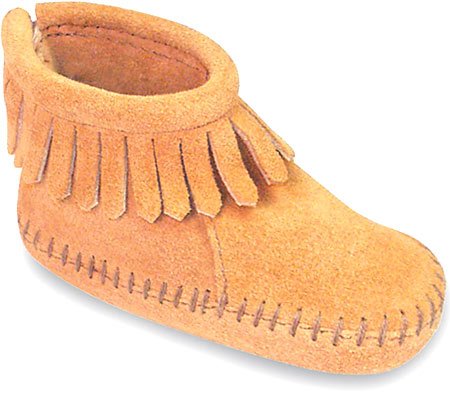 The classic Minnetonka moccasin keeps smaller feet comfortable and warm. Soft suede or deerskin leather upper in an ankle-height casual bootie style, with stitching and seaming accents, matching shaft fringe embellishment and a padded collar. A Velcro(R) back panel makes wearing easy. Soft suede lining, cushioned insole. Flexible midsole and smooth suede indoor style outsole. Read more...